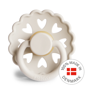 FRIGG Fairytale with scalloped edges and hearts surrounding the shield mimic one specific paper cutting by H. C. Andersen. The 8 little hearts support the universality of his creative work, and they symbolize love, the universal language of the world. This is the inspiration that lies within the FRIGG Fairytale pacifiers: They are approachable for everyone because love is a language, everyone can speak and understand.