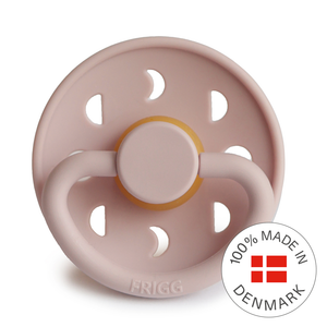 FRIGG Moon Phase is a round pacifier with a round nipple shape. The round pacifier resembles a mother’s breast in both shape and material. The explanation for this is that when the child is about to breastfed, the tongue rolls up around the nipple and creates a vacuum, which causes the milk to flow. When the child sucks on a round pacifier, it rolls its tongue around it the same way.