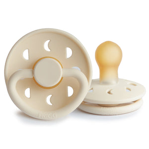 FRIGG Moon Phase is a round pacifier with a round nipple shape. The round pacifier resembles a mother’s breast in both shape and material. The explanation for this is that when the child is about to breastfed, the tongue rolls up around the nipple and creates a vacuum, which causes the milk to flow. When the child sucks on a round pacifier, it rolls its tongue around it the same way.